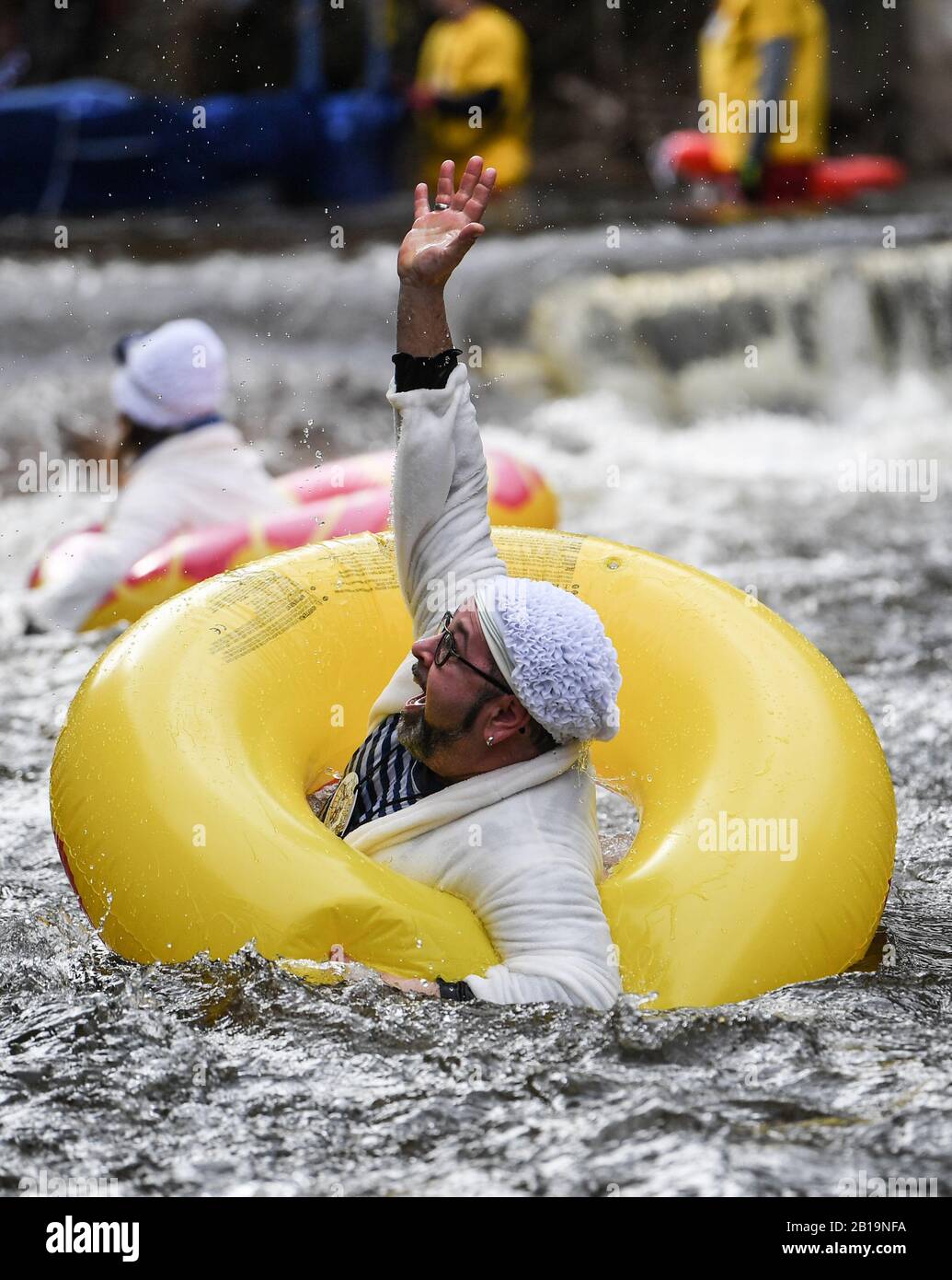 Rottweil, Germany. 24th Feb, 2020. Janina Brändle and Alexander Kohlen swim under the motto “Aqua-Fun in the Kirchenbach - Rulantica 2.0” during the Da-Bach-na ride on the Schiltach. 40 participants drove with
