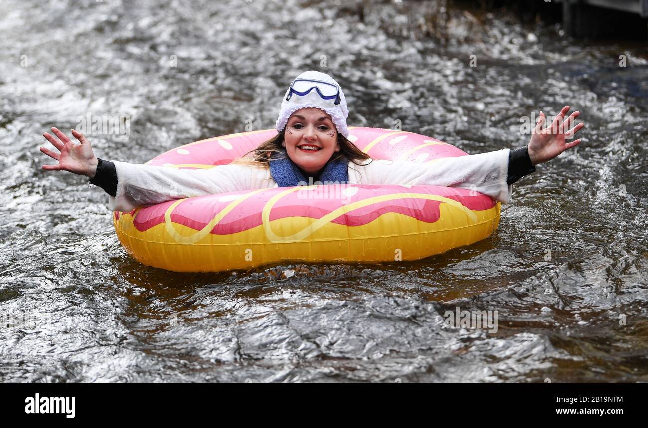 Rottweil, Germany. 24th Feb, 2020. Janina Brändle swims under the motto " Aqua fun in the church stream - Rulantica 2.0" during the Da-Bach-na ride on the Schiltach. 40 participants drove with their "