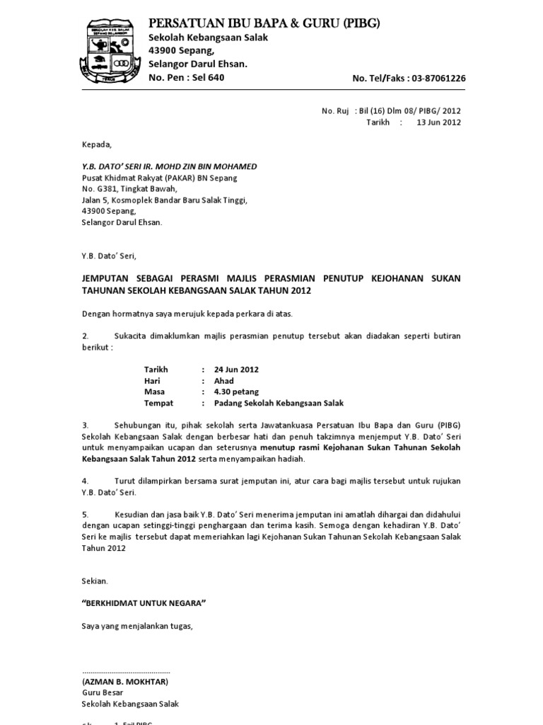 contoh surat jemputan ibu bapa ke program sekolah