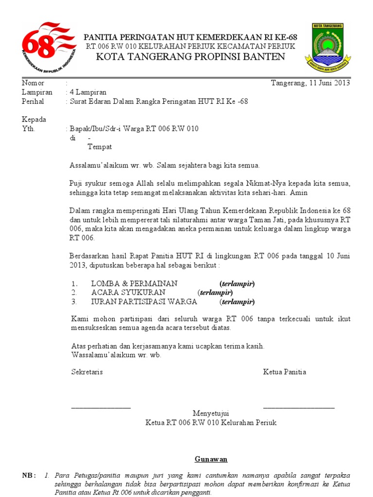 Contoh Surat Undangan Resmi Rapat Ketua RT HUT RI | Belajar Office