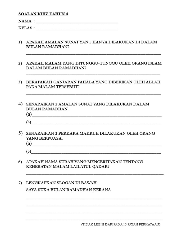 Soalan Kuiz Tahun 4: (Tidak Lebih Daripada 15 Patah Perkataan)