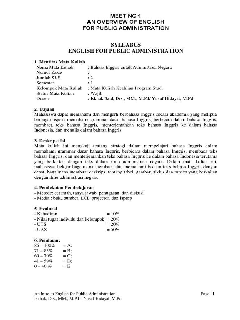 Silabus 1. Identitas mata kuliah Nama Mata kuliah : Basic English for Tourism Kode mata kuliah : MR201 SKS : 2 sks Semester/j