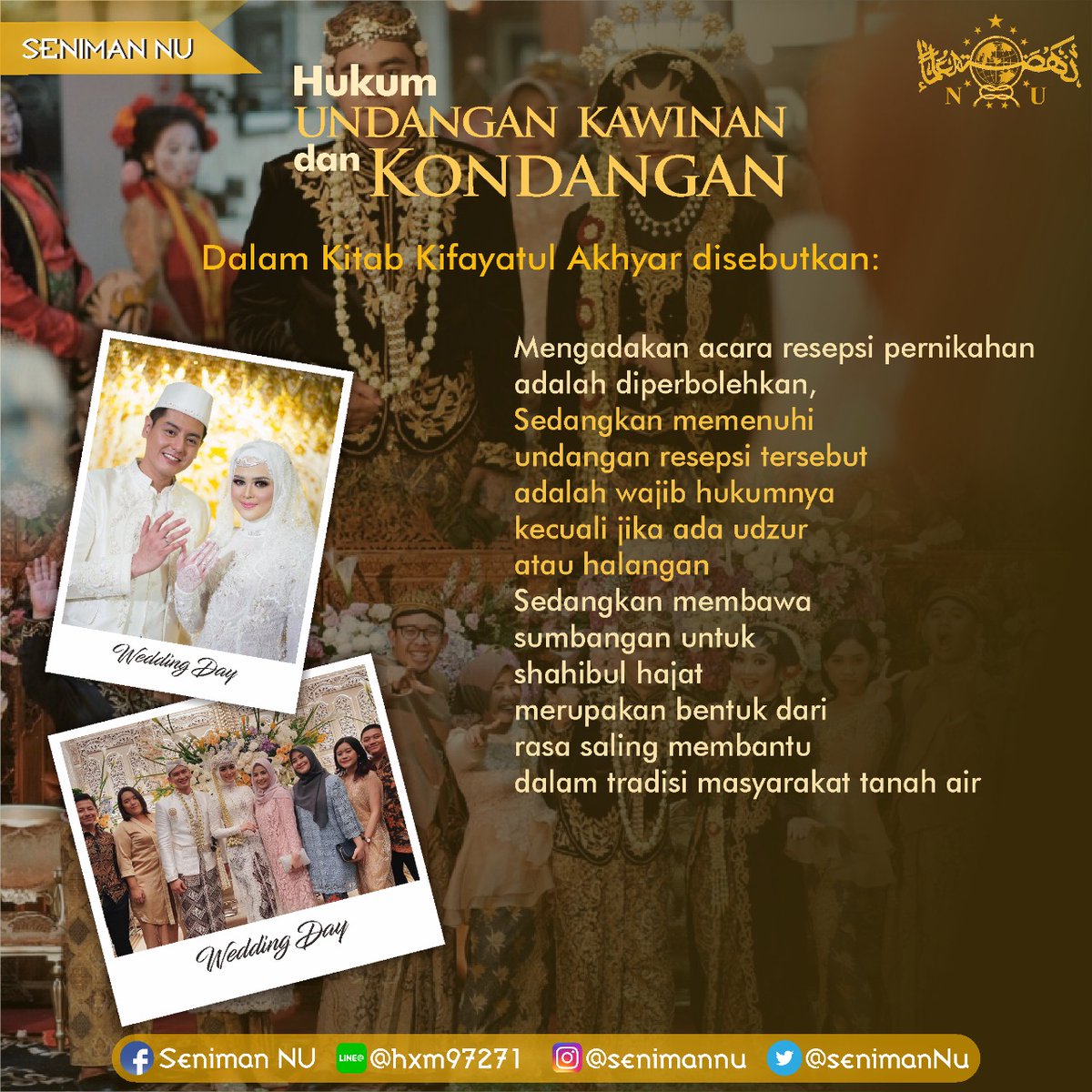 Seniman NU: “Hukum Undangan Kawinan dan Kondangan~ Menghadiri undangan pesta perkawinan walimatul ‘arsy adalah sesuatu yang wajib menurut fiqih jika tidak ada halangan (udzur syar’) sebagaimana dalam Kitab Kifayatul Akhyar yang