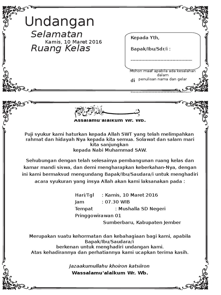 Contoh Surat Undangan Syukuran Ruang Kelas Baru Sekolah Induk
