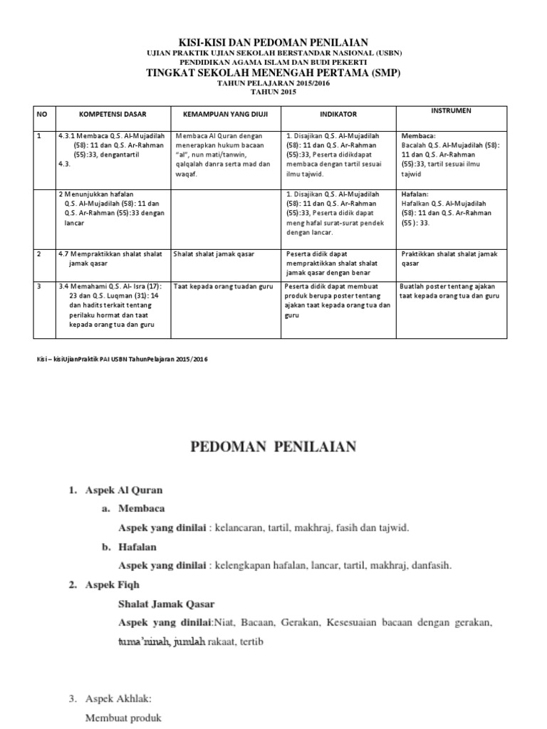 KISI-KISI DAN PEDOMAN PENILAIAN dan pedoman penilaian ujian praktik ujian sekolah berstandar nasional
