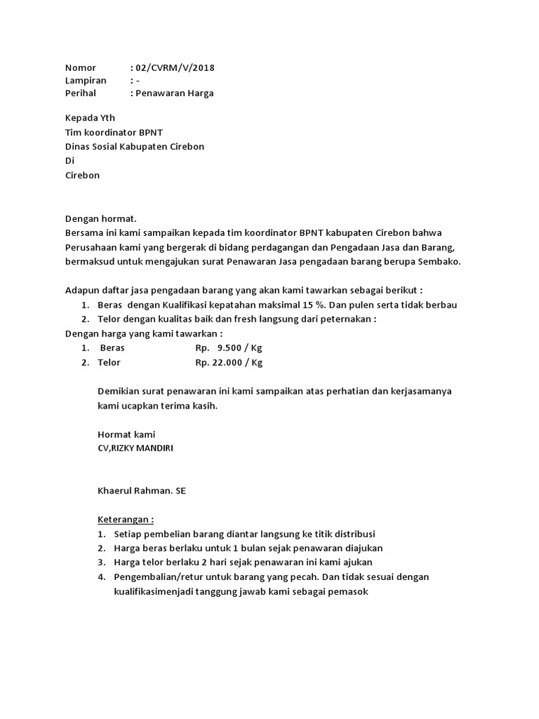 Contoh Surat Penawaran Barang Produk Negosiasi Makanan Harga | ruangguruku.com