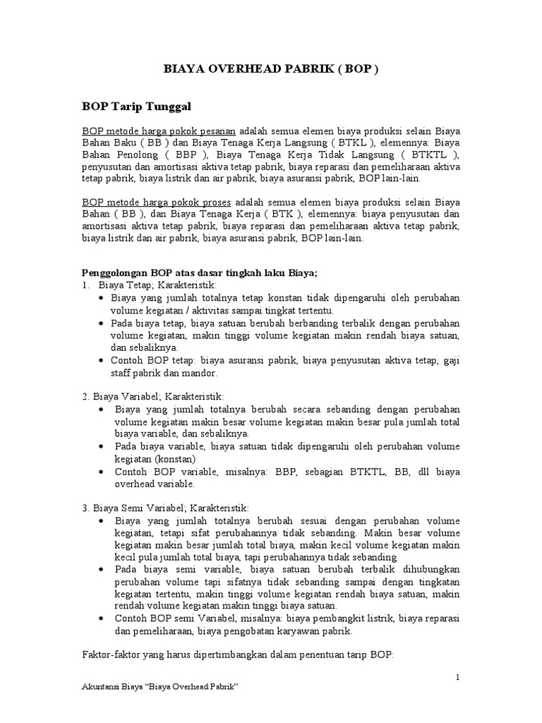 DOC) BIAYA OVERHEAD PABRIK ( BOP ) BOP Tarip Tunggal | Prasetio …