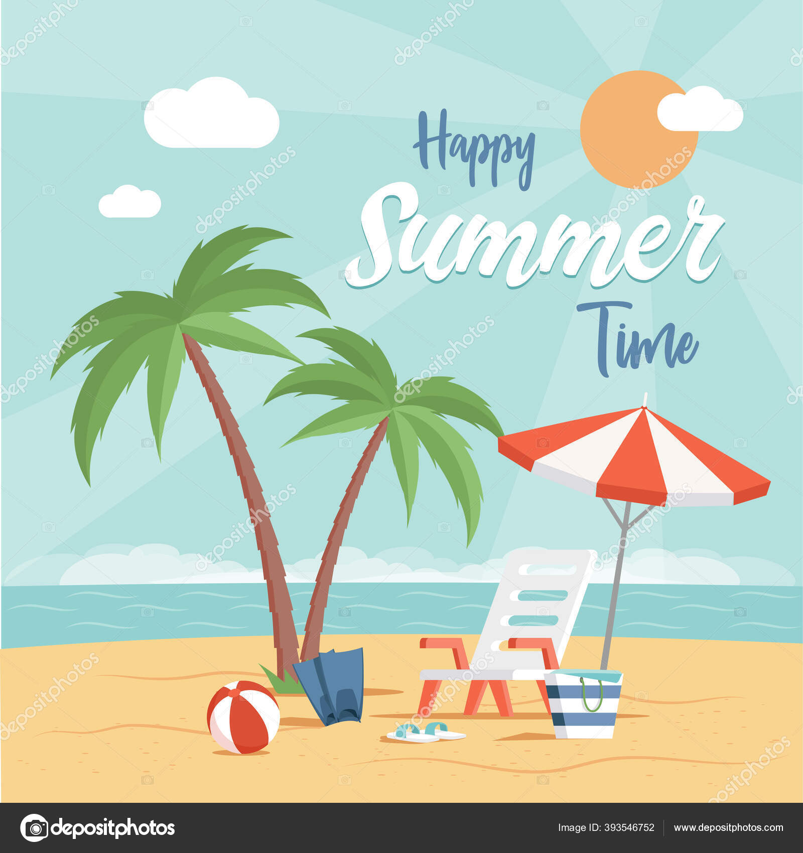 Selamat musim panas vektor waktu datar poster desain dengan ruang teks. Liburan pesta pantai, liburan di templat laut. Stok Vektor © plahotya #393546752