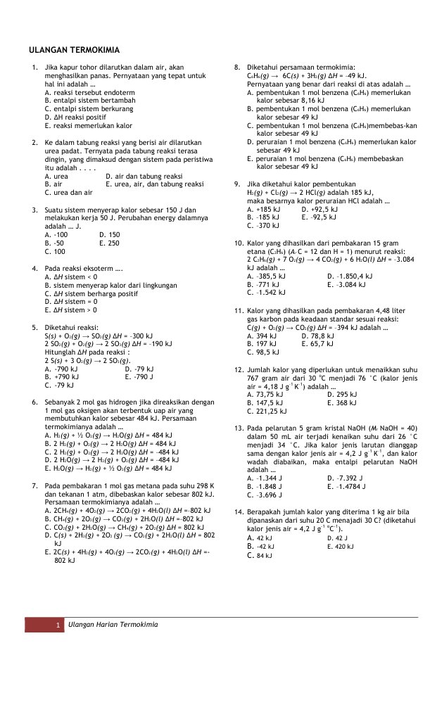Bank Soal Kimia Bab Termokimia Dan Hidrokarbon