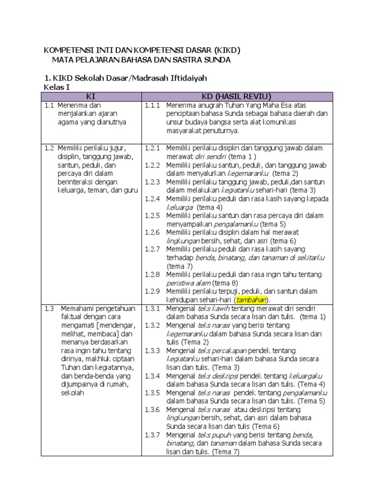 Kompetensi Inti Dan Kompetensi Dasar Kikd Mata Pelajaran Bahasa Sunda