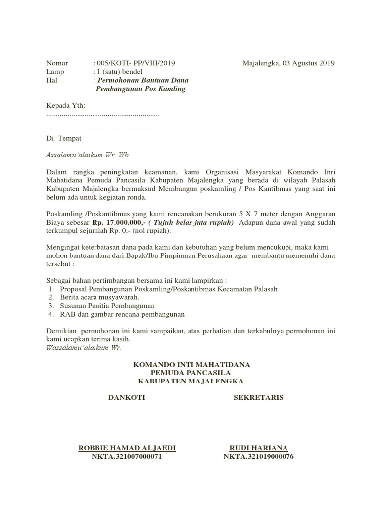 Surat Permohonan Bantuan Dana Pembangunan Pos Ronda - Kumpulan Surat Penting