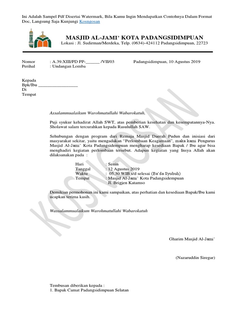 Contoh Undangan Lomba Masjid Formal